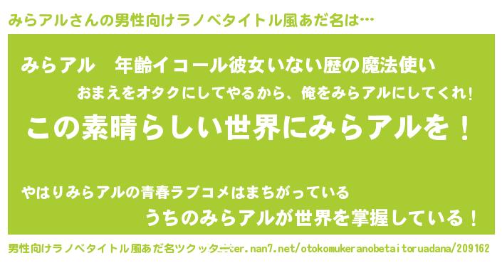 | 女子向けラノベタイトル風あだ名 | 『悪役みらアルに転生したようですが、知った事ではありません』 |
