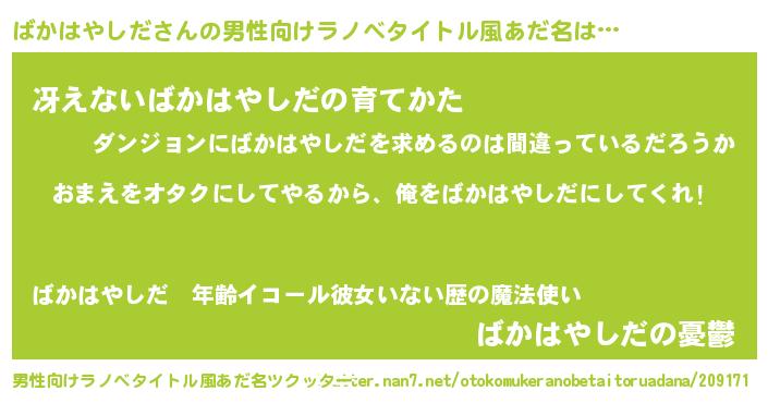 | 女子向けラノベタイトル風あだ名 | 『ばかはやしだ夫妻のなれそめ』 |