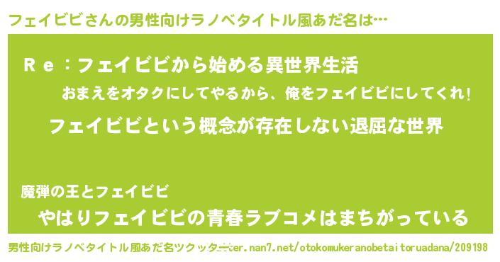 | 女子向けラノベタイトル風あだ名 | 『異世界で失敗しない100のフェイビビ』 |
