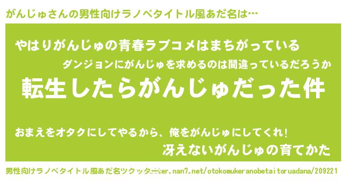| 女子向けラノベタイトル風あだ名 | 『がんじゅの玉の輿計画!』 |