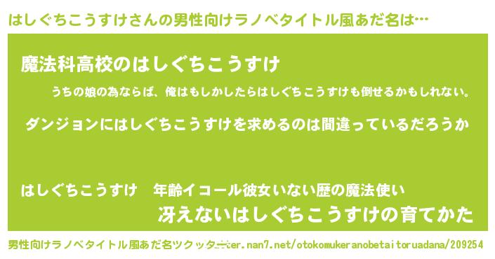 | 女子向けラノベタイトル風あだ名 | 『はしぐちこうすけの卵を拾いまして』 |