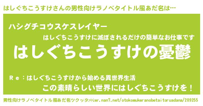| 女子向けラノベタイトル風あだ名 | 『(仮)はしぐちこうすけのやんごとなき事情』 |