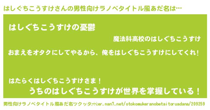 | 女子向けラノベタイトル風あだ名 | 『はしぐちこうすけ夫妻のなれそめ』 |
