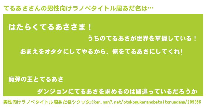 | 女子向けラノベタイトル風あだ名 | 『てるあさ夫妻のなれそめ』 |