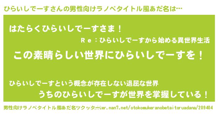 | 女子向けラノベタイトル風あだ名 | 『乙女ゲームの破滅フラグしかない悪役ひらいしでーすに転生してしまった…』 |