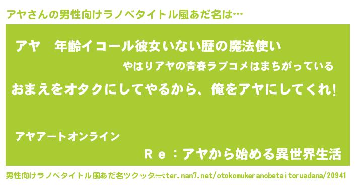 | 女子向けラノベタイトル風あだ名 | 『アヤ夫妻のなれそめ』『闇のアヤ』 |
