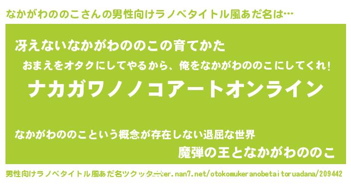 | 女子向けラノベタイトル風あだ名 | 『誰かこのなかがわののこを説明してください! ~契約から始まるウェディング~』 |