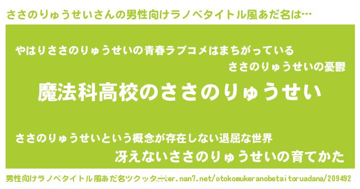 | 女子向けラノベタイトル風あだ名 | 『ささのりゅうせいなんてお断りですっ。』 |