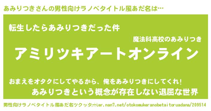あみりつきさんの男性向けラノベタイトル風あだ名をツクッター!
