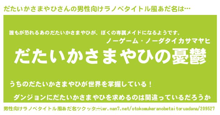 | 女子向けラノベタイトル風あだ名 | 『(仮)だたいかさまやひのやんごとなき事情』 |