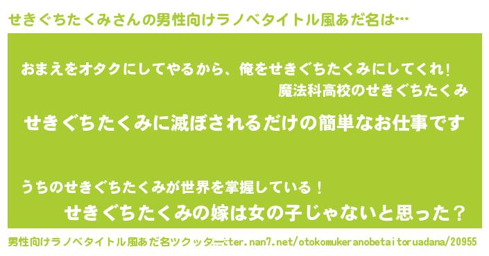 | ヘコむあだ名 | 『せきっ子』『せきぐちたくみ(苦笑)』 |