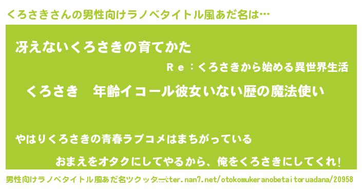 | 女子向けラノベタイトル風あだ名 | 『くろさきの玉の輿計画!』 |