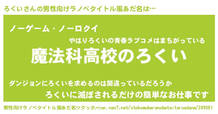 | 女子向けラノベタイトル風あだ名 | 『ろくいなんてお断りですっ。』 |