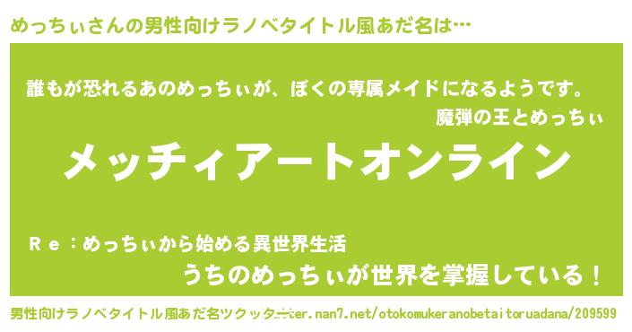 | 胡散臭い通販商品みたいなあだ名 | 『モテモテ間違いなし霊験あらたかなお札…その名も「めっちぃ」』 |