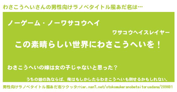 | 女子向けラノベタイトル風あだ名 | 『悪役わさこうへいに転生したようですが、知った事ではありません』 |