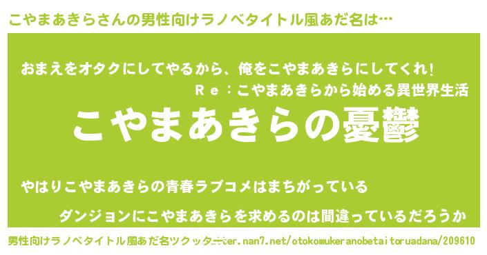 | 女子向けラノベタイトル風あだ名 | 『こやまあきら姫と円卓の騎士』 |