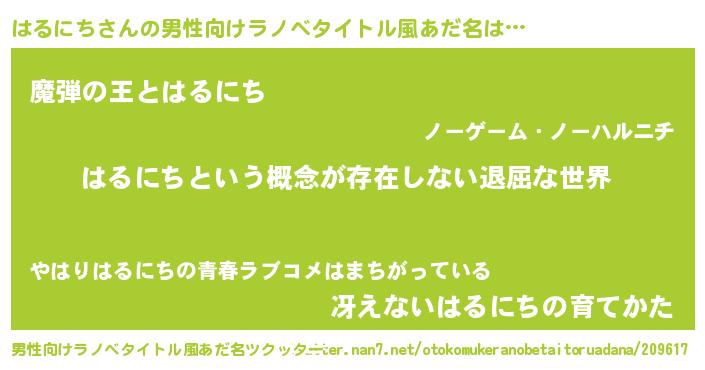 | 女子向けラノベタイトル風あだ名 | 『はるにちの契約王妃』『はるにち恋絵巻』 |