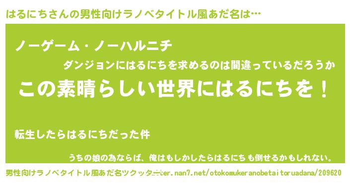 | 女子向けラノベタイトル風あだ名 | 『乙女ゲームの破滅フラグしかない悪役はるにちに転生してしまった…』 |