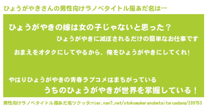 | 女子向けラノベタイトル風あだ名 | 『ひょうがやき夫妻のなれそめ』 |