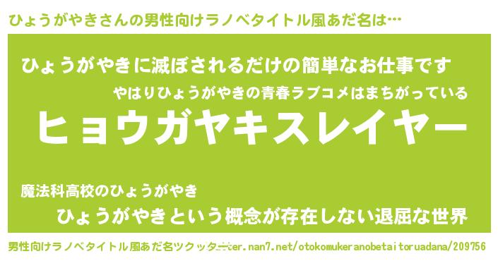| 胡散臭い通販商品みたいなあだ名 | 『絶対に幸福をもたらす健康食品…その名も「ひょうがやき」』 |