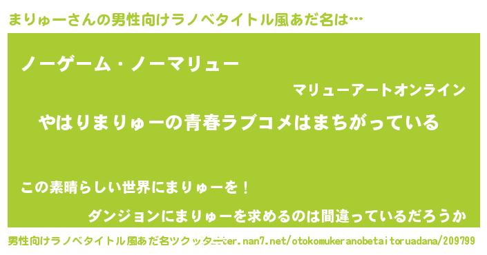 | 女子向けラノベタイトル風あだ名 | 『まりゅーの雑貨屋さん』 |