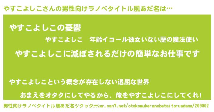 | ヘコむあだ名 | 『やすにゅー』『やすこよしこ(小並感)』 |