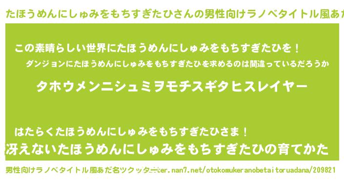 | 胡散臭い通販商品みたいなあだ名 | 『ハリウッド女優が絶賛した世界で10本だけ現存している希少なブランデー…その名も「たほうめんにしゅみをもちすぎたひ」』 |