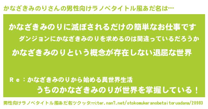 | 女子向けラノベタイトル風あだ名 | 『かなざきみのりの契約王妃』 |