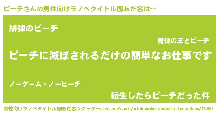 | 意味不明あだ名 | 『もやし科ピーチ属』『自称ピーチ』 |
