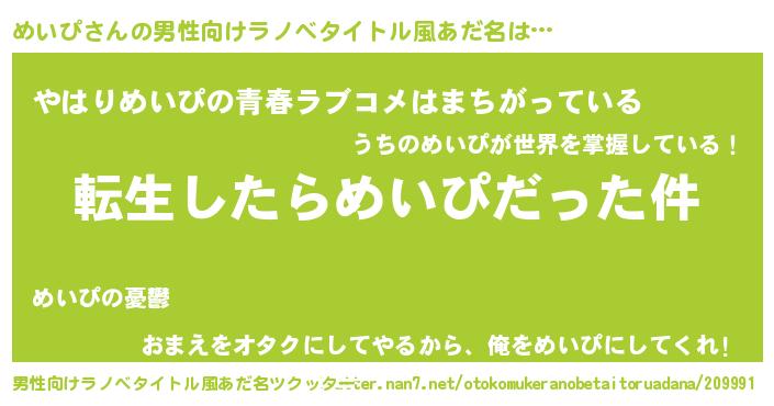 | ヘコむあだ名 | 『豆乳』『めいにゅー』『めいぴ(爆)』 |