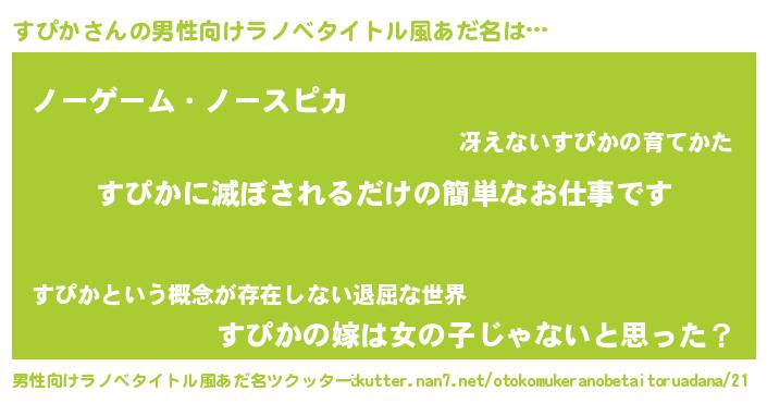 | 女子向けラノベタイトル風あだ名 | 『横柄すぴかと宰相陛下』『すぴか恋絵巻』 |