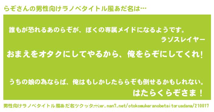 | 女子向けラノベタイトル風あだ名 | 『らぞ夫妻のなれそめ』『らぞの契約王妃』 |
