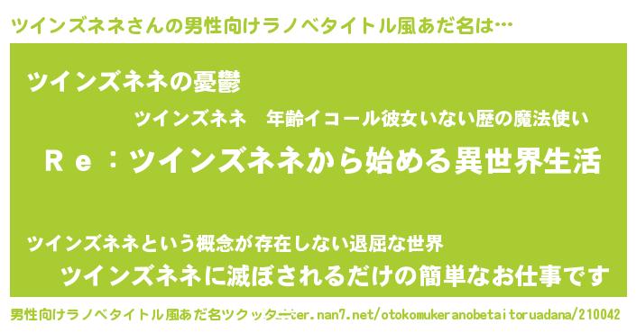 | ヒーロー風カッコイイあだ名 | 『最強戦士ツインズネネ』『天弓騎士ツイ』 |