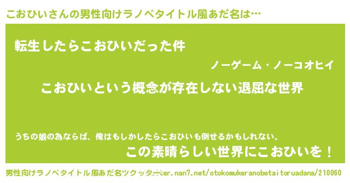 | 女子向けラノベタイトル風あだ名 | 『異世界で失敗しない100のこおひい』 |