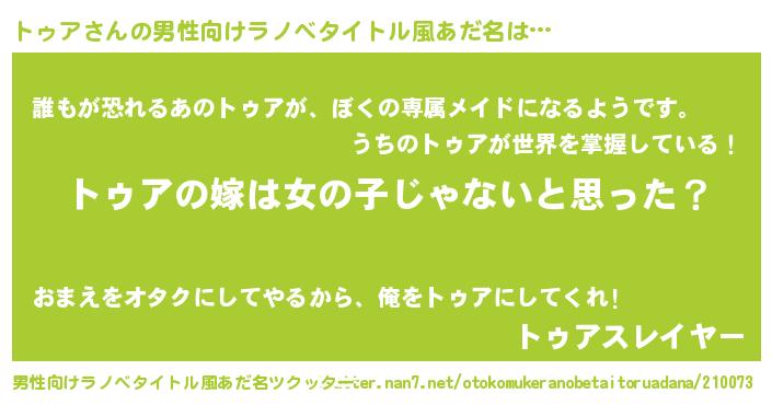 | 女子向けラノベタイトル風あだ名 | 『トゥア様がみてる』『トゥアの契約王妃』 |