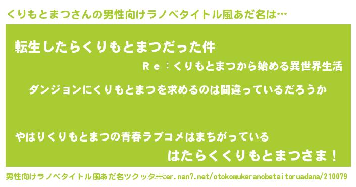 | 胡散臭い通販商品みたいなあだ名 | 『信頼と実績のサプリメント…その名も「くりもとまつ」』 |