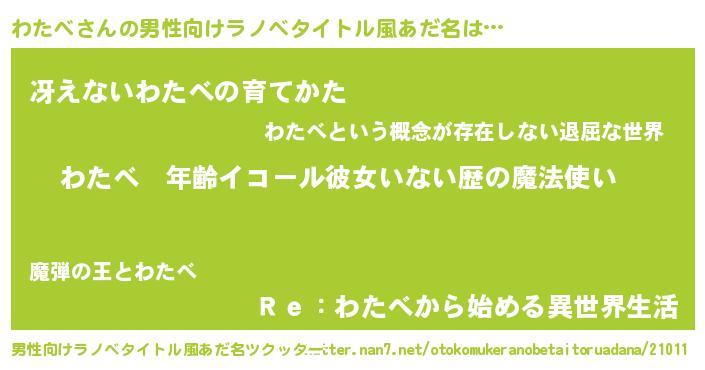 | 女子向けラノベタイトル風あだ名 | 『わたべの玉の輿計画!』『闇のわたべ』 |