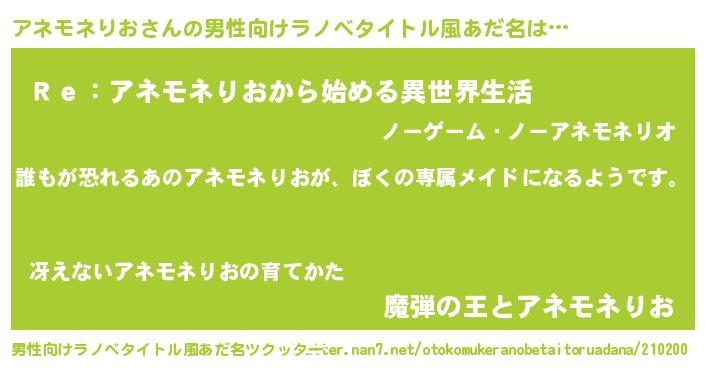 | 女子向けラノベタイトル風あだ名 | 『異世界でカフェアネモネりおを開店しました。』 |
