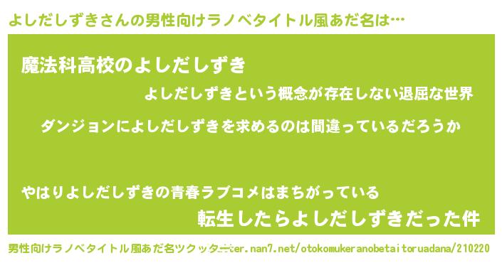 | ヘコむあだ名 | 『よしっちょ』『よしだしずき(苦笑)』 |