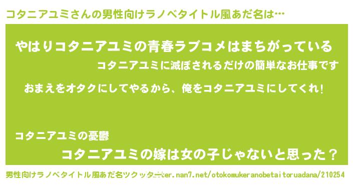 | 女子向けラノベタイトル風あだ名 | 『コタニアユミ夫妻のなれそめ』 |