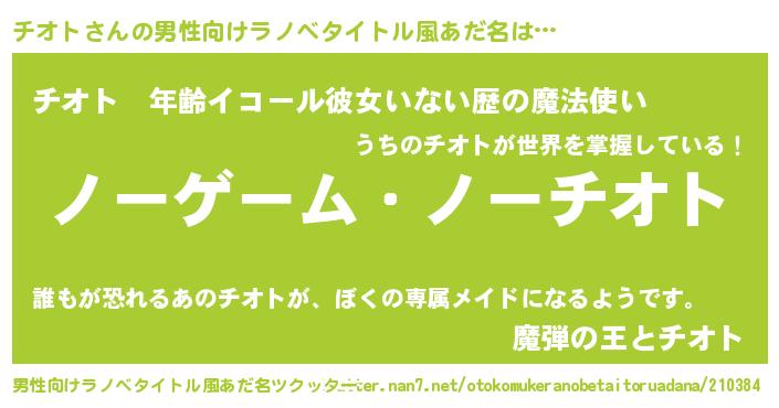 | 女子向けラノベタイトル風あだ名 | 『死神チオトの再婚』『チオトの契約王妃』 |
