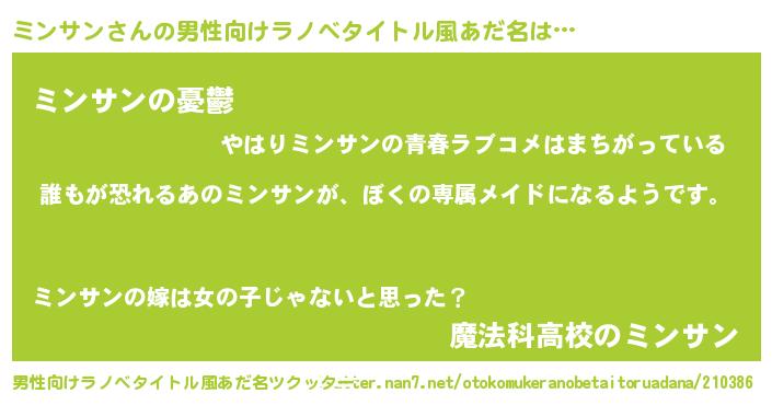 | 女子向けラノベタイトル風あだ名 | 『ミンサンの契約王妃』 |