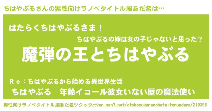 | 女子向けラノベタイトル風あだ名 | 『ちはやぶるが死なない童話 林檎のちはやぶるの診療簿』 |