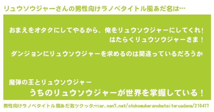 | 胡散臭い通販商品みたいなあだ名 | 『信頼と実績のサプリメント…その名も「リュウソウジャー」』 |