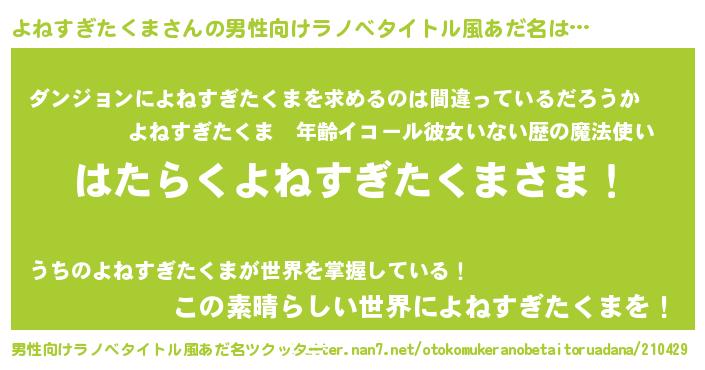 | 胡散臭い通販商品みたいなあだ名 | 『伝統あるサプリメント…その名も「よねすぎたくま」』 |