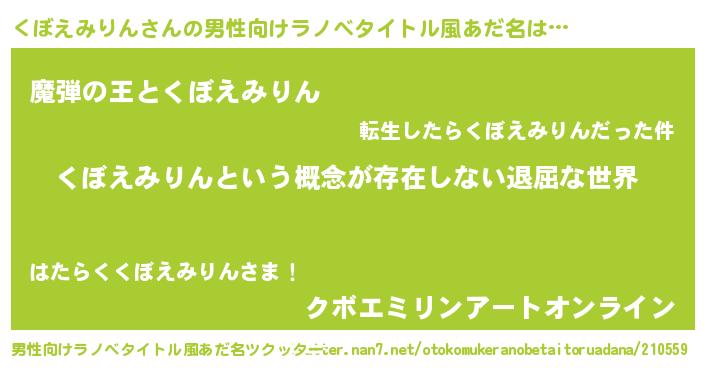 | 女子向けラノベタイトル風あだ名 | 『異世界で失敗しない100のくぼえみりん』 |