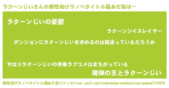 | 女子向けラノベタイトル風あだ名 | 『ラクーンじいの卵を拾いまして』 |
