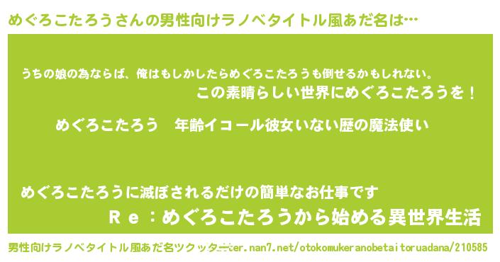| 女子向けラノベタイトル風あだ名 | 『めぐろこたろうの玉の輿計画!』 |