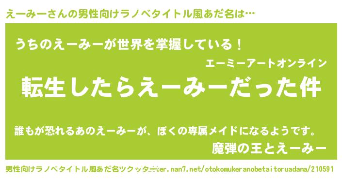 | 女子向けラノベタイトル風あだ名 | 『えーみーの玉の輿計画!』 |