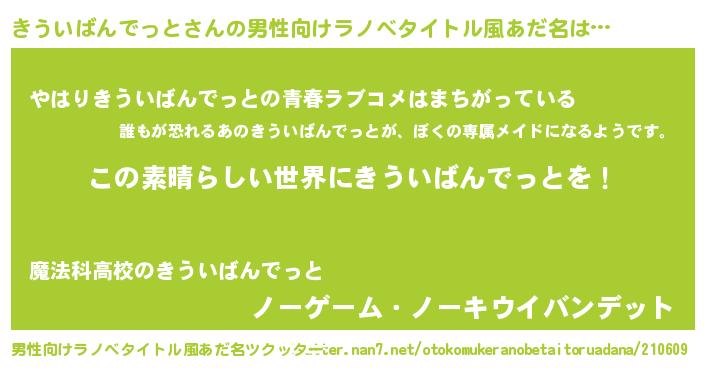 | 女子向けラノベタイトル風あだ名 | 『悪役きういばんでっとに転生したようですが、知った事ではありません』 |